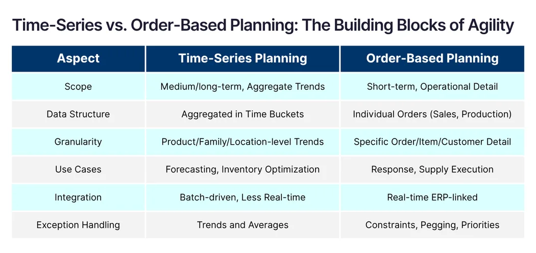 Time-series planning establishes the strategic direction by optimizing inventory, forecasting demand, and planning supply over a period of weeks or months. Order-based planning focuses on individual customer orders, enabling instant reactions and finely tuned supply responses. HPA allows you to combine both approaches for optimal supply chain performance.