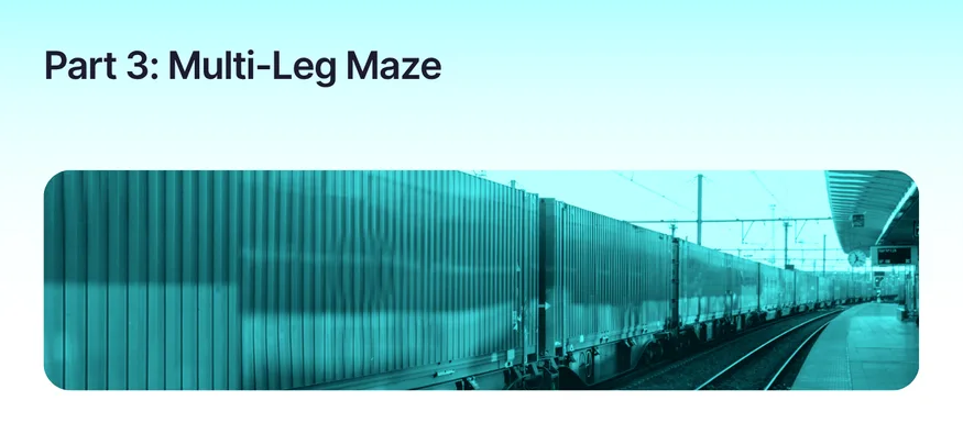 🚛 Truck to the port → 🚢 Ocean → 🚂 Rail → 🚛 Final-mile truck.
